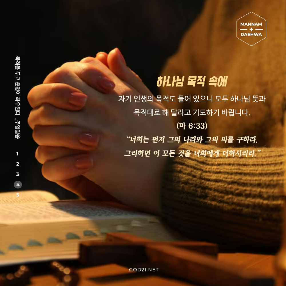 하나님 목적 속에 자기 인생의 목적도 들어 있으니 모두 하나님 뜻과 목적대로 해 달라고 기도하기 바랍니다.