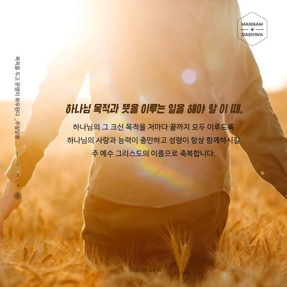 하나님 목적과 뜻을 이루는 일을 해야 할 이 때, 하나님의 그 크신 목적을 저마다 끝까지 모두 이루도록 하나님의 사랑과 능력이 충만하고 성령이 항상 함께하시길 주 예수 그리스도의 이름으로 축복합니다.