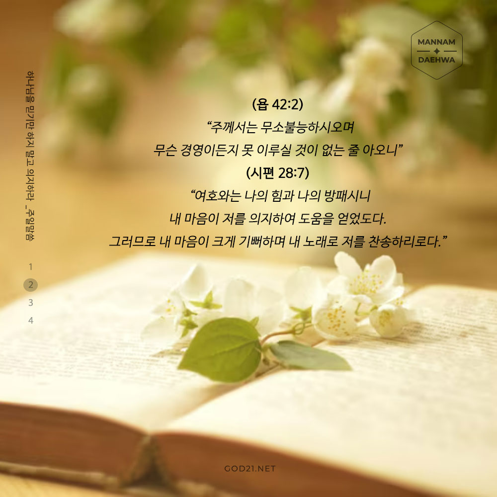 무소불능한 하나님을 믿기만 하지 말고 의지해야 힘도 받고, 문제도 해결되고, 희망을 이루게 됩니다.