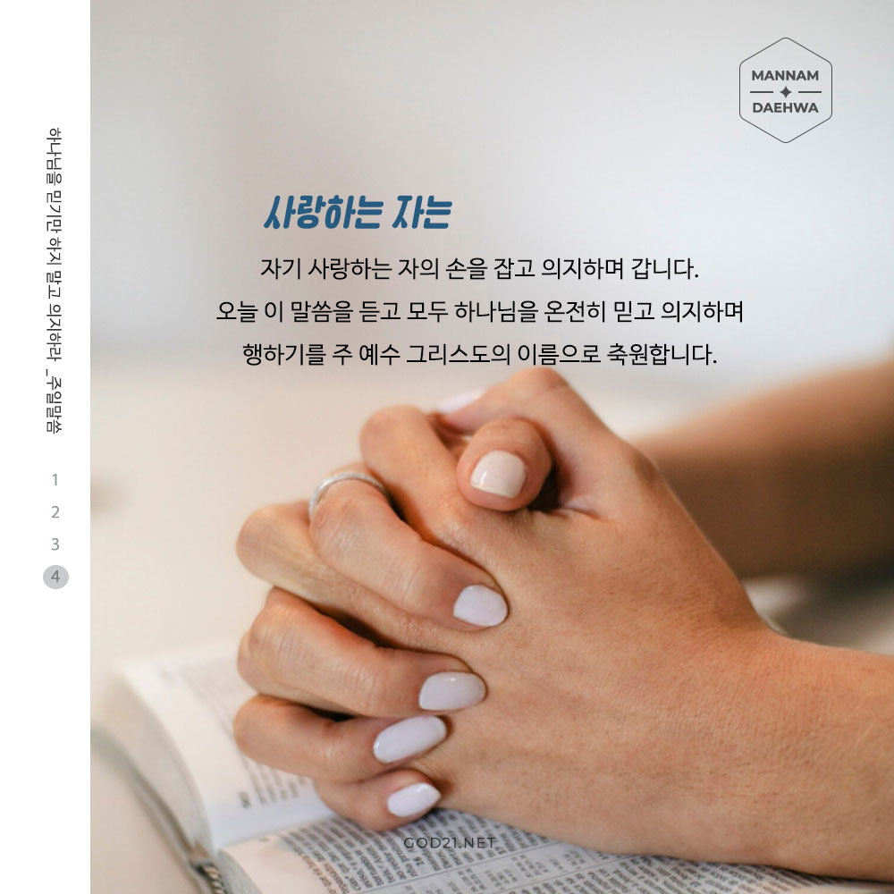 사랑하는 자는 자기 사랑하는 자의 손을 잡고 의지하며 갑니다. 오늘 이 말씀을 듣고 모두 하나님을 온전히 믿고 의지하며 행하기를 주 예수 그리스도의 이름으로 축원합니다.