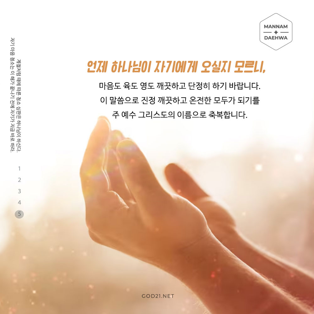 언제 하나님이 자기에게 오실지 모르니 마음도 육도 영도 깨끗하고 단정히 하기 바랍니다.