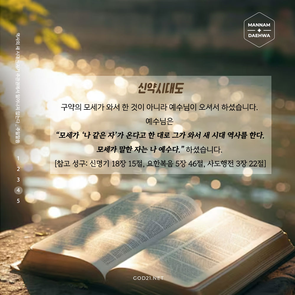 예수님은 “모세가 ‘나 같은 자’가 온다고 한 대로 그가 와서 새 시대 역사를 한다. 모세가 말한 자는 나 예수다.” 하셨습니다.
